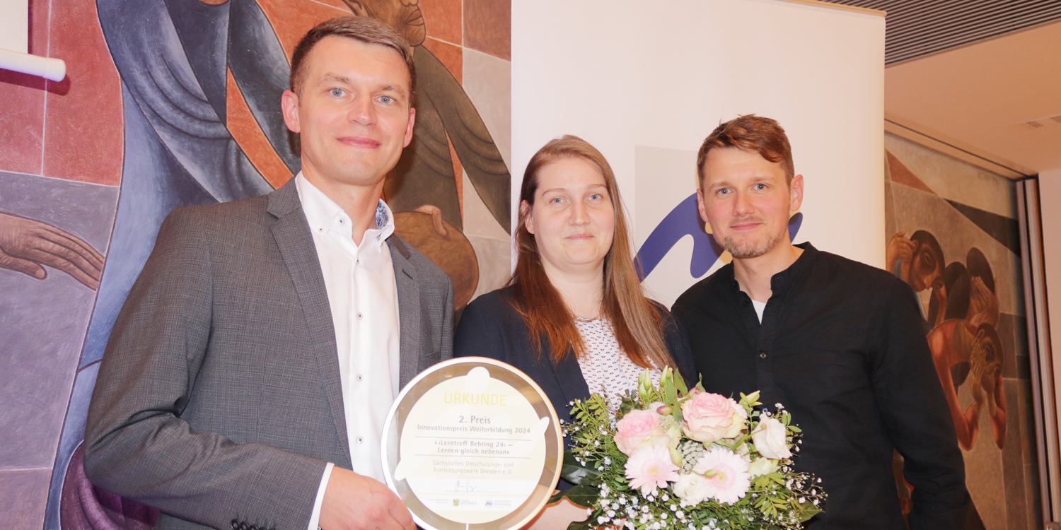 Auf die Mitarbeitenden und die Geschäftsleitung des SUFW Dresden e. V. wartete am 18. September 2024 eine große Überraschung: Das erste Mal in der Vereinsgeschichte ist ein Bildungsprojekt mit dem Innovationspreis Weiterbildung des Freistaates Sachsen ausgezeichnet worden. Den Preis für den 2. Platz überreichte Dresdens Oberbürgermeister Dirk Hilbert an Gino Schneider (Vorstand) sowie den Mitarbeitenden Georg Mühlberg (Leitung Lerntreff „Behring24“) und Stefanie Elies (VHS Dresden). Der Preis wurde zum 23. Mal vergeben und zeichnet innovative Weiterbildungsprojekte sächsischer Bildungsträger aus.
